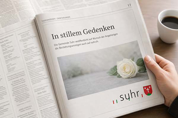 Bei einem Todesfall erhalten die Angehörigen die Möglichkeit, kostenfrei eine Bestattungsanzeige auf suhr.ch unter "Mitteilungen" und/oder im Anschlagkasten bei den Verwaltungsgebäuden zu veröffentlichen. In der Regel bleibt die Bestattungsanzeige bis zur Bestattung publiziert. Auf Absprache sind andere Publikationszeiten möglich.